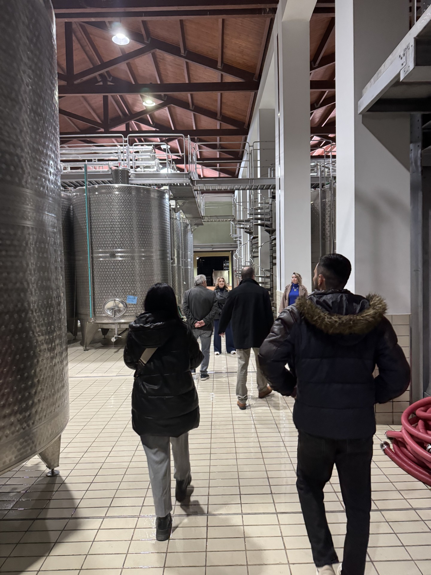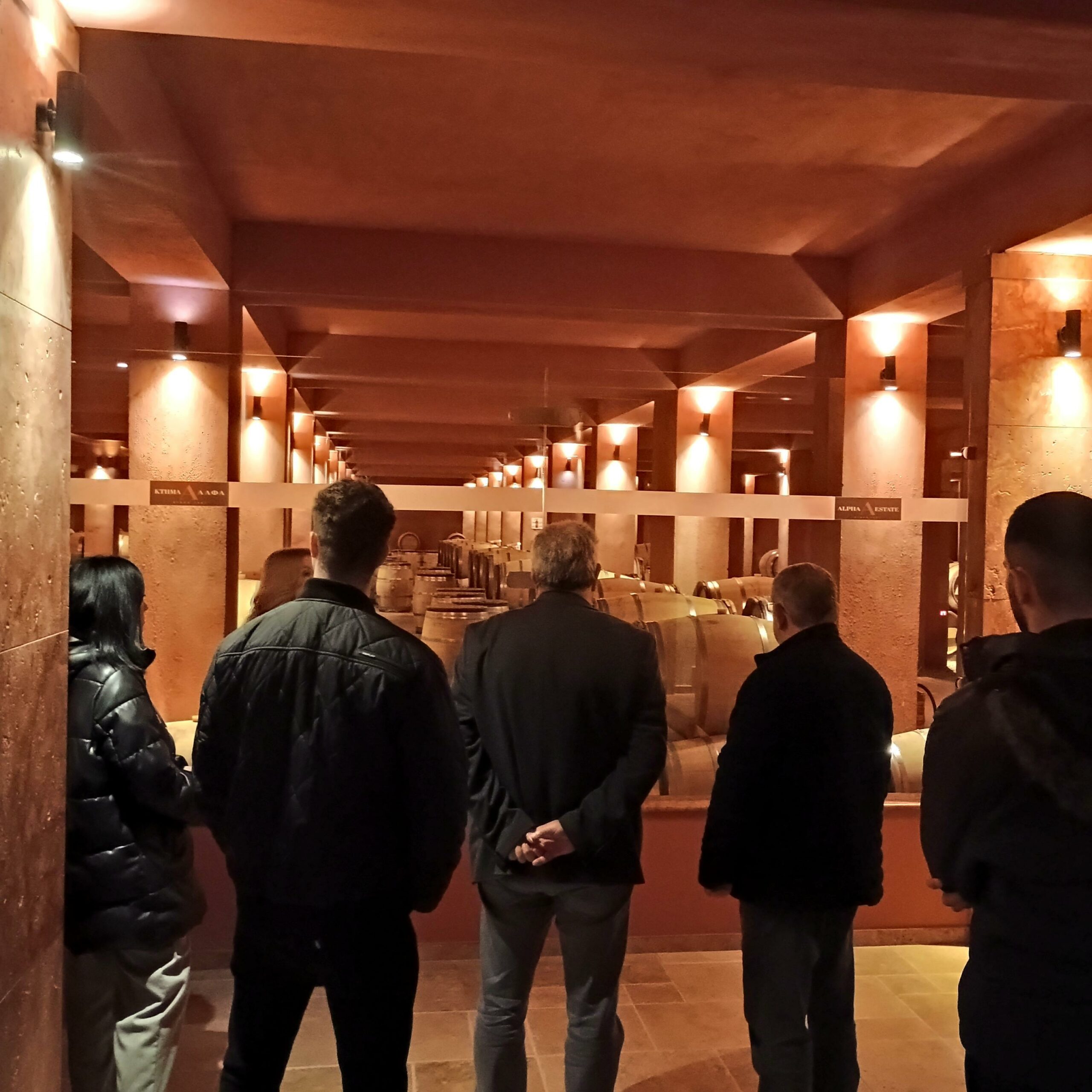 Κατά τη διάρκεια της επίσκεψης, οι συμμετέχοντες είχαν την ευκαιρία να γνωρίσουν όλα τα στάδια παραγωγής του κρασιού. Η ξενάγηση ξεκίνησε από την παραλαβή και την αρχική επεξεργασία των σταφυλιών, συνεχίστηκε με την παρουσίαση των χώρων ζύμωσης και ωρίμανσης και ολοκληρώθηκε με την εμφιάλωση, τη συσκευασία και τις πρακτικές αποθήκευσης. Οι υπεύθυνοι του Κτήματος ανέδειξαν τη σημασία της συνεχούς παρακολούθησης της ποιότητας σε κάθε στάδιο, καθώς και τον ρόλο της τεχνολογίας στη βελτιστοποίηση της παραγωγικής διαδικασίας. Επιπλέον, παρουσιάστηκε η ιστορική διαδρομή του Κτήματος ΑΛΦΑ, από τα πρώτα του βήματα μέχρι την εξέλιξή του σε ένα πρότυπο οινοποιείο με διεθνείς διακρίσεις.