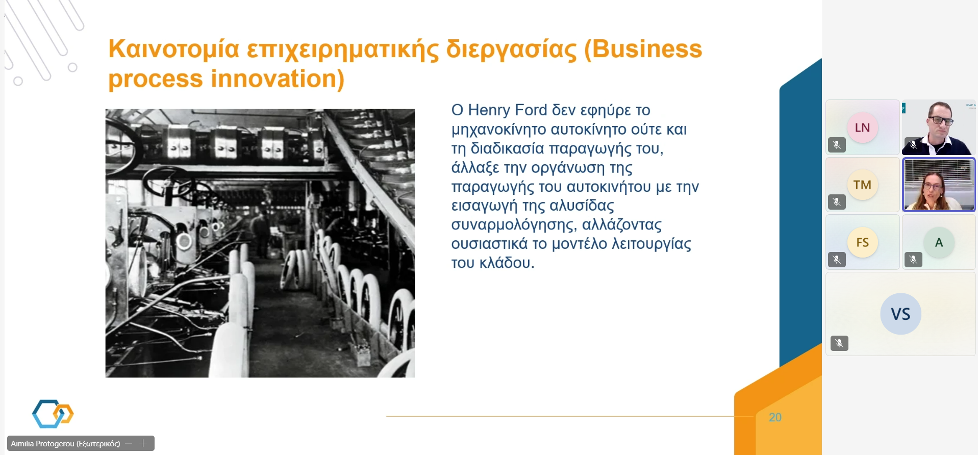 Το εργαστήριο είχε διαδραστικό χαρακτήρα, ενθαρρύνοντας τους συμμετέχοντες να θέτουν ερωτήματα και να συμμετέχουν στη συζήτηση, ώστε στη συνέχεια να εφαρμόσουν τις έννοιες της καινοτομίας στη λειτουργία και ανάπτυξη της δικής τους επιχείρησης.