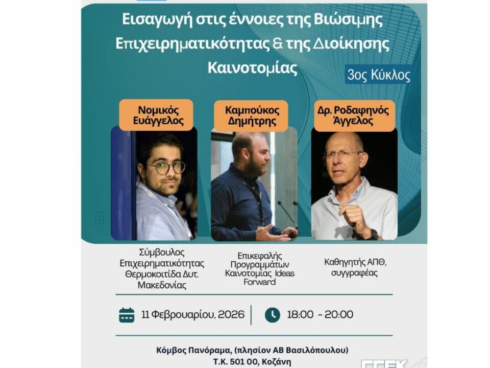 Το 1ο Εργαστήριο Ανοικτής Καινοτομίας της Θερμοκοιτίδα Επιχειρηματικότητας Δυτικής Μακεδονίας, με τίτλο: «Η έννοια της καινοτομίας και της καινοτόμου επιχειρηματικότητας», πραγματοποιήθηκε το απόγευμα της Τετάρτης 19 Νοεμβρίου 2025. Στόχος της δράσης ήταν να εισαγάγει τους ωφελούμενους στις βασικές αρχές της καινοτομίας και στον καθοριστικό ρόλο της στη σύγχρονη επιχειρηματική ανάπτυξη. Την εκδήλωση παρακολούθησαν με ιδιαίτερο ενδιαφέρον οι ωφελούμενοι που εντάχθηκαν στη Θερμοκοιτίδα κατά τον 1ο κύκλο υποδοχής αιτήσεων.