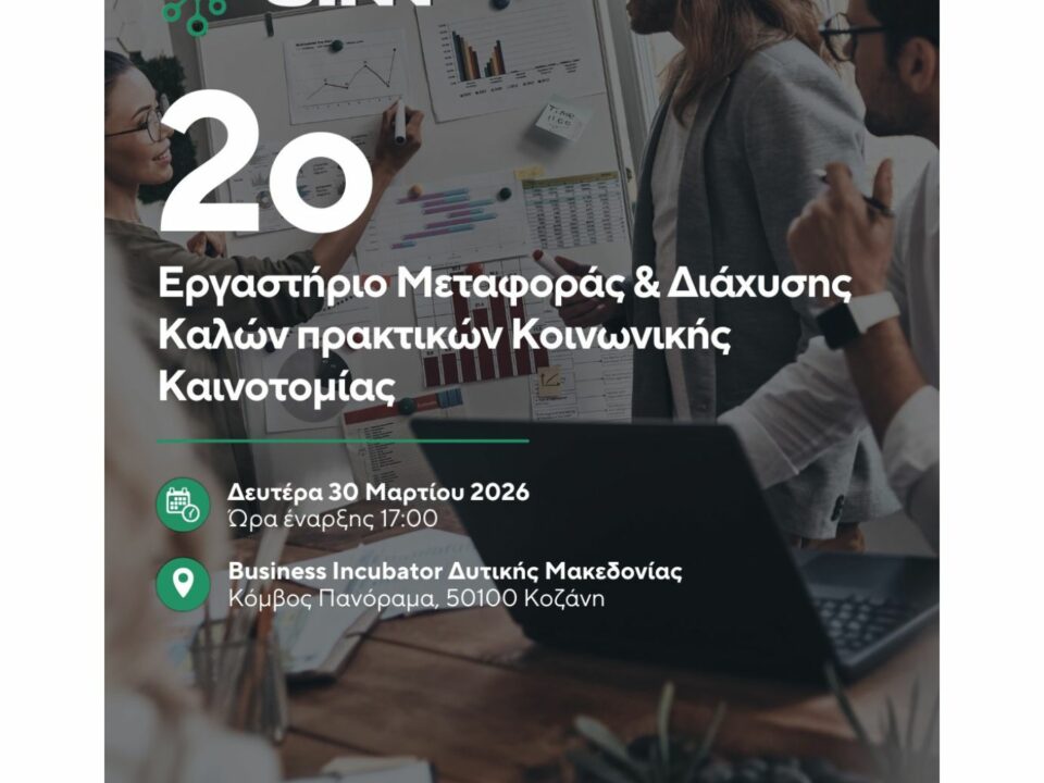 Η Θερμοκοιτίδα Επιχειρηματικότητας Δυτικής Μακεδονίας φιλοξένησε τη Δευτέρα 30 Μαρτίου 2026, στην Κοζάνη, το 2ο Εργαστήριο Μεταφοράς και Διάχυσης Καλών Πρακτικών Κοινωνικής Καινοτομίας, στο πλαίσιο του έργου «Παροχή Εξειδικευμένων Υπηρεσιών Σχεδιασμού, Ανάπτυξης και Υλοποίησης Στοχευμένων Παρεμβάσεων Κοινωνικής Καινοτομίας και Επιχειρηματικότητας στις περιοχές ΔΑΜ».