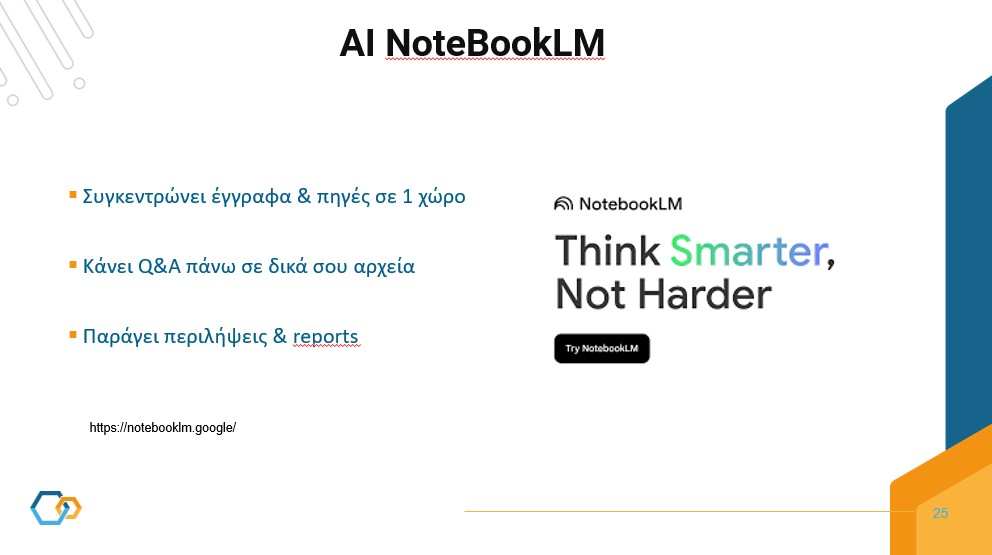 Στα εργαστήρια παρουσιάστηκαν στην πράξη εφαρμογές όπως ChatGPT, Claude, Perplexity, Gemini, NotebookML, Nano Banana και άλλα χρήσιμα εργαλεία για την καθημερινή εργασία, την έρευνα και την επιχειρηματικότητα. Παρουσιάστηκαν επίσης πρακτικές εφαρμογές σε επιχειρηματικό σχεδιασμό, μάρκετινγκ και άλλους τομείς, ώστε οι ωφελούμενοι να αποκτήσουν δεξιότητες που ενισχύουν άμεσα την παραγωγικότητα και την ανάπτυξη της επιχείρησής τους.