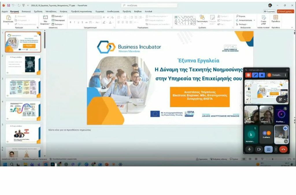 Το απόγευμα της 18 Φεβρουαρίου 2026 πραγματοποιήθηκαν τα Εργαστήρια Στοχευμένης Κατάρτισης με τίτλο: «Έξυπνα Εργαλεία: Η Δύναμη της Τεχνητής Νοημοσύνης στην Υπηρεσία της Επιχείρησής σου», τα οποία υλοποιήθηκαν σε δύο διαδοχικές ώρες, 16.00 – 18.00 και 18.00 – 20.00, για τους ωφελούμενους της Θερμοκοιτίδας Επιχειρηματικότητας Δυτικής Μακεδονίας.